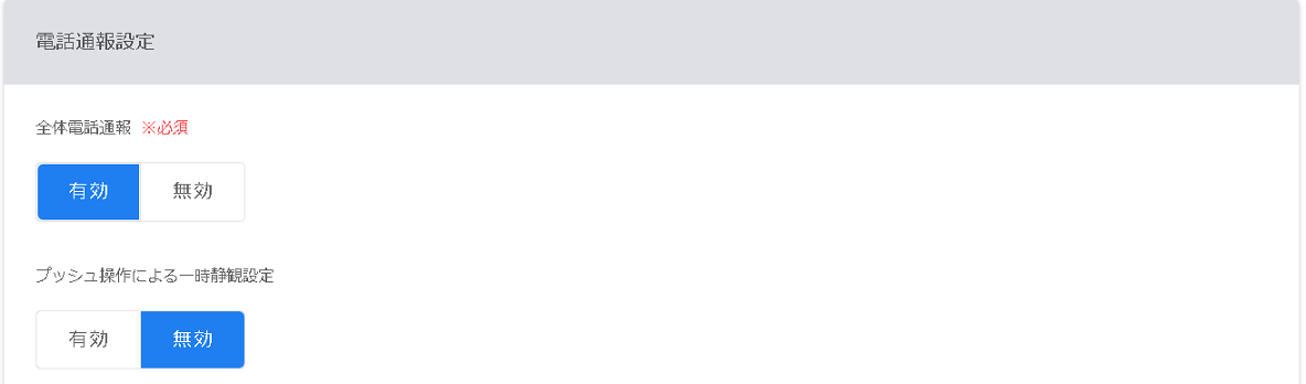 | 全体電話通報 | 本プロジェクト全体で電話通報を行うかどうかを指定します。「無効」を指定した場合、電話通報は行われません。 | |