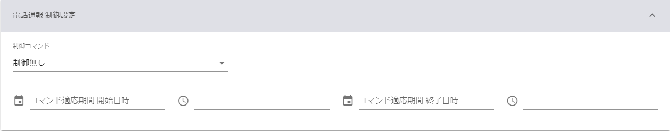 | 制御コマンド | 予定済みの電話通報をキャンセルしたい場合、「キャンセル」を指定します。 電話通報を一時的に停止したい場合、「一時停止」を指定します。 コマンドによる制御を行わない場合、「制御なし」に指定を戻します。 | キャンセルを指定した場合、当該時間帯の電話通報は発呼中のものも含めてキャンセルされます。 一時停止を指定した場合は、一時停止の期間が過ぎてから電話通報が行われます。 |