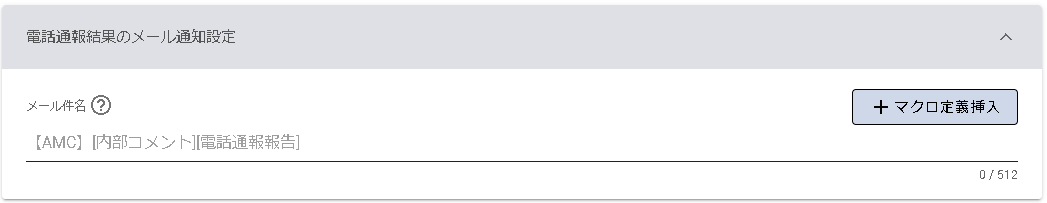 | メール件名 | 電話通報時に通知する通報結果メールの件名を指定します。未指定の場合、【WebSAM Cloud 通報サービス】[内部コメント][電話通報報告] となります。 | 「マクロ定義挿入」にて、電話通報ステータス・プロジェクト名・パターン名・(連結)通報グループ名を指定可能です。電話通報結果のメール通知の有無は、通報グループ管理にて指定可能です。 電話通報結果メールの詳細については こちら を参照してください。 メール件名は最大で512文字であり、マクロ展開後の文字列が513文字以上の場合、512文字目までが件名に記載されます。 |