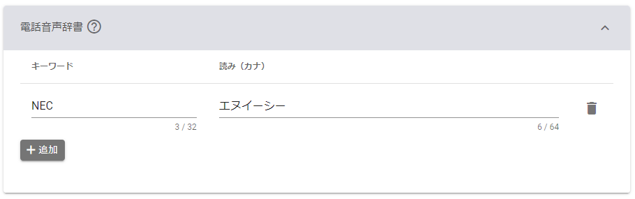| 読み(カナ) | 変換後の読み方をカタカナで指定します。 | 全角カタカナ、句読点「、」「。」を入力可能です。句読点は読み上げの区切り文字として使用できます。 |