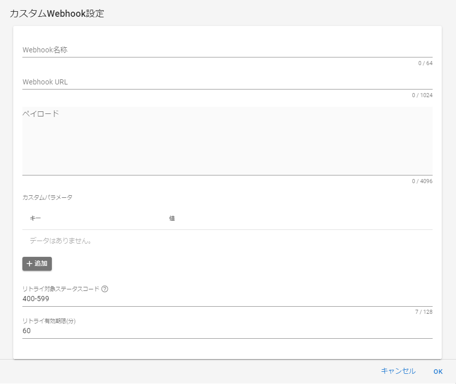 | シンプルWebhook | ステータスコードが400-599の場合、または、レスポンスタイムアウト、コネクションタイムアウトが発生した場合、5分間隔でリトライ処理を行います。継続的リトライの有効期限は60分です。 |