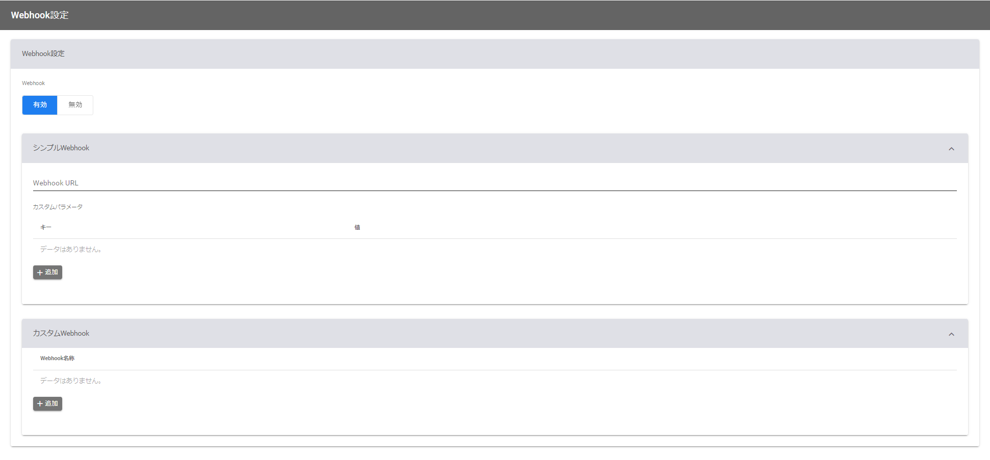 シンプルWebhookは互換性のために残されており、すでにシンプルWebhookを利用されている場合のみ表示され、シンプルWebhookを新しく利用することはできません。 シンプルWebhookの定義を消した場合は再度使用することはできないため、新しくカスタムWebhookを定義しなおしてください。シンプルWebhookと同じペイロードについてはペイロードで利用可能なマクロ一覧を参照ください。