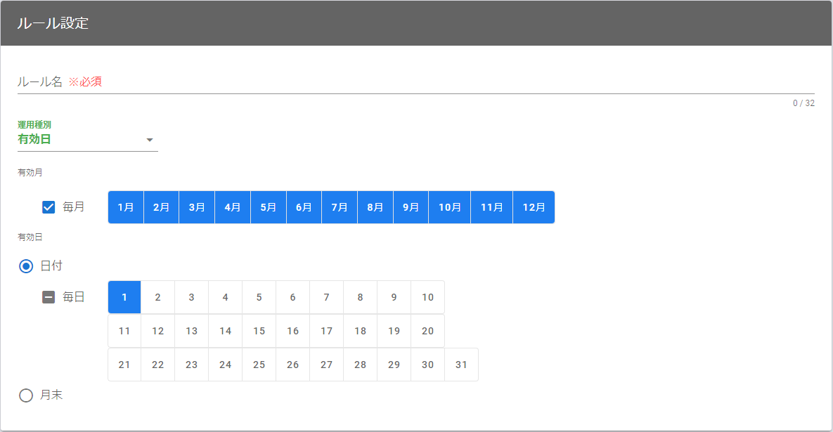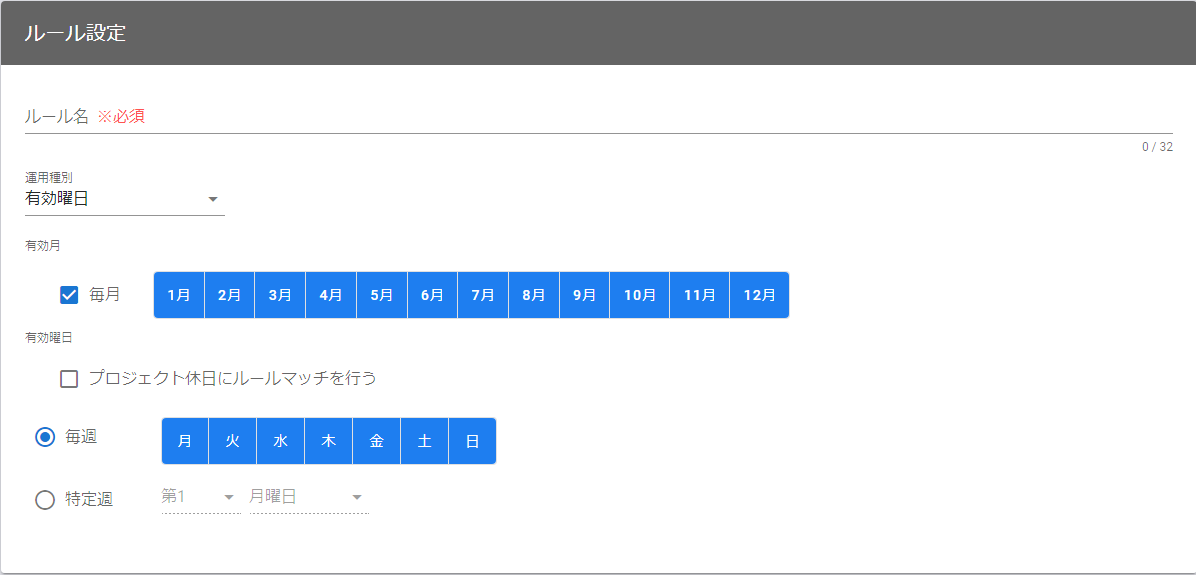 | 有効月 | ルールの運用を有効にする月を選択します。特定の月だけルールマッチするという運用が行えます。 | デフォルトは毎月です。 |