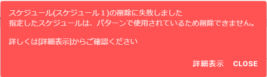 - スケジュール削除のエラー画面(パターンに紐づくスケジュールを削除した場合)