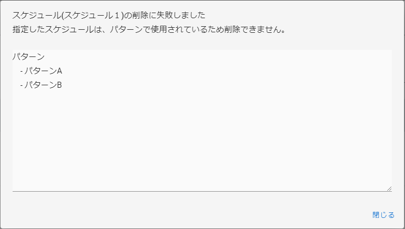 パターンに紐づくスケジュールを削除した場合は削除エラーが表示されます。 「詳細表示」をクリックすることで、紐ついたバターンを確認することができます。