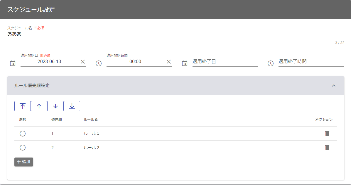 | 優先順 | ルールを選択して画面上部の矢印を指定することで、ルールの優先順を変更できます。優先順の高いルールからマッチ判定を行い、いずれかのルールにマッチした時点でスケジュールの判定結果はマッチとなります。スケジュールの判定結果がマッチの場合は、後続のルールについてはマッチ判定は行いません。 |