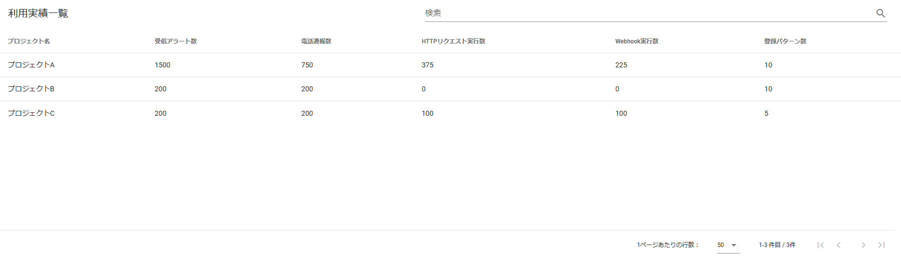 | Webhook実行数 | プロジェクト毎のWebhook通報件数を表示します。 | Webhook通報を利用いないプロジェクトの場合は表示されません。 |