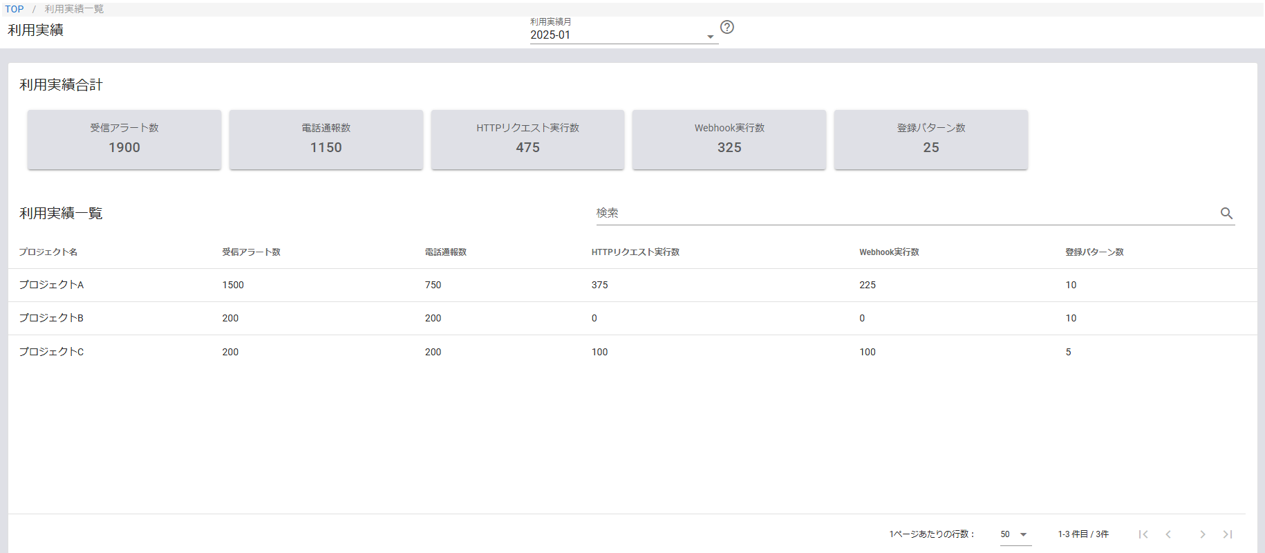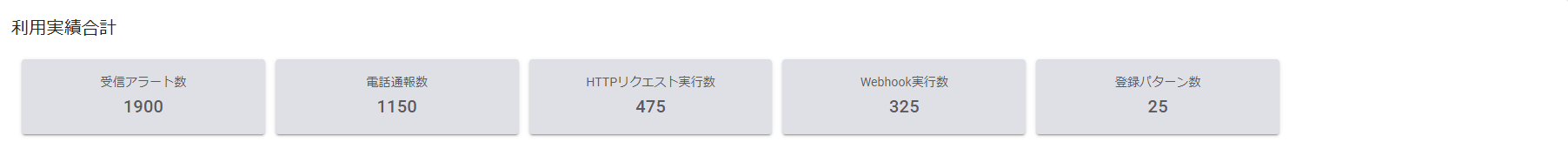過去6ヶ月間の利用実績(受信アラート数、電話通報数、HTTPリクエスト実行数、Webhook実行数、登録パターン数)を月別に表示します。