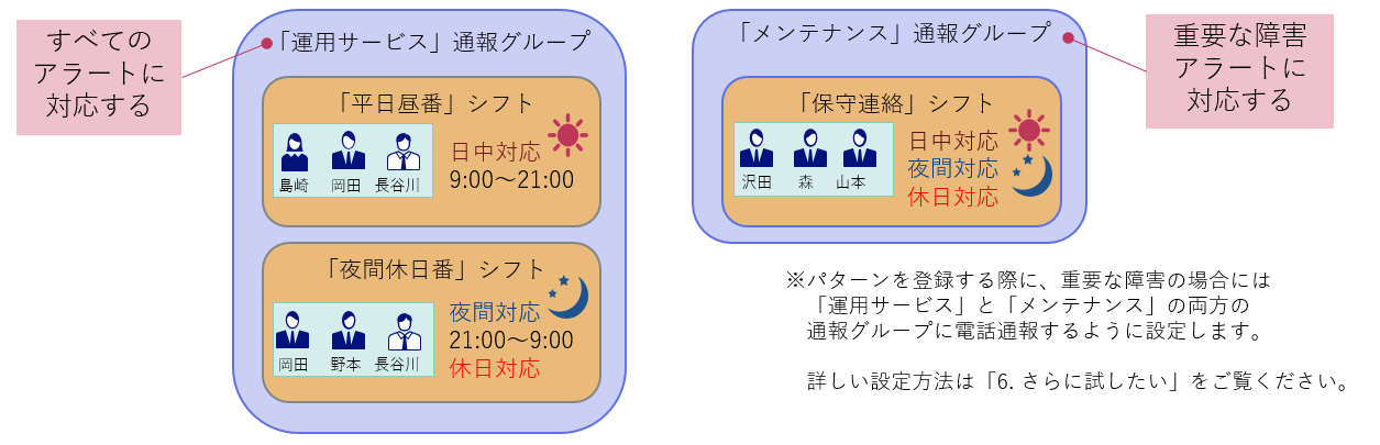 - 上の例は複数の通報グループ(輪番体制)に同時に通報したい場合の構成です。