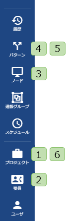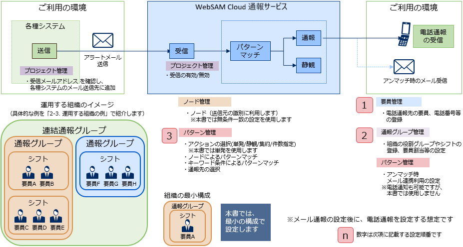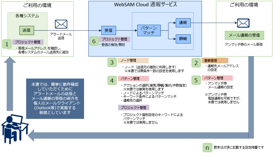 設定順 管理メニュー 設定内容 補足 1 プロジェクト管理 受信メールアドレス 確認 WebSAM Cloud 通報サービス宛てにアラートメールを送信する際の宛先メールアドレスを確認します。 2 要員管理 要員とメールアドレスの登録 要員の氏名、メール通報先のメールアドレスを登録します。 3 ノード管理 ノードの登録 パターンマッチ条件に使用するノードを登録します。無条件に一致させる場合はノードの登録は不要で、パターン登録時に設定をスキップできます。(本資料では部分一致の設定を紹介します) 4 パターン管理 パターンの登録(パターンマッチ設定、通報設定) アラートメールのパターンマッチ条件を設定します。メール通報を有効にし、メール通報先を指定します。 5 パターン管理 アンマッチ時の通報設定 パターンマッチ条件に合致しない場合に、メールでお知らせるためのメール通報先を追加します。 6 プロジェクト管理 メール受信の有効化 有効にすることで、WebSAM Cloud 通報サービスがアラートメールの受信を開始します。
