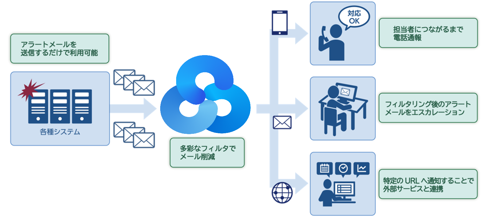 - WebSAM Cloud 通報サービス は、各種システムからのアラートメールをフィルタリング(WebSAM Cloud 通報サービスではパターンマッチと呼称)して、障害等の重要情報だけを電話またはメールで確実に担当者へお知らせする「クラウド型 通報サービス(SaaS)」です。