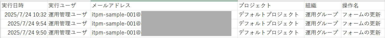 監査ログ_yyyyymmddhhmmss.csvというファイル名でCSVファイルがダウンロードされます。