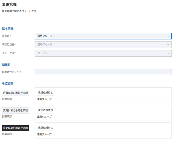 • ステータス(評価結果の確定・変更計画の確定・クローズ全てに承認を必須とする場合は変更不可)