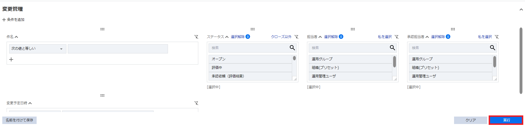 - フィルタ名を入力し 保存 をクリックすると、右セクションの保存済フィルタに保存されます。