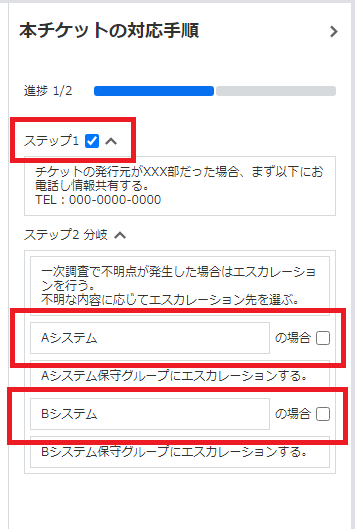 対応手順に全てチェックが付いた時点で次ステップ手順への誘導ダイアログは表示されなくなり、対応完了となります