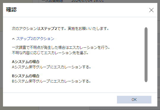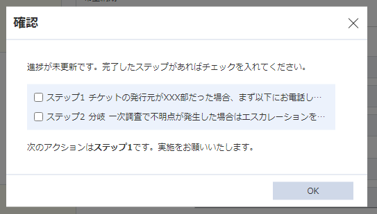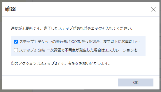 対応手順のうち未チェックの項目が残っている場合は、次ステップの手順へ誘導するダイアログが表示されます。次回以降の対応時にこちらの手順を実施するようにしてください