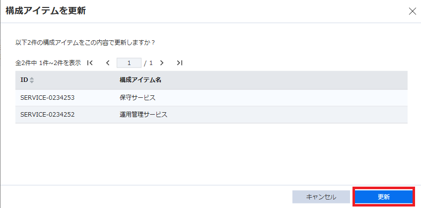 - 「構成アイテムを一括更新」をクリックし、構成アイテムの一括更新画面に遷移します。