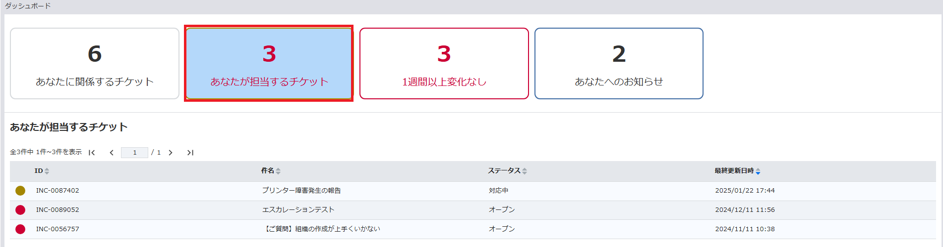 - 「あなたが担当するチケット」をクリックすると、対象のチケットの一覧を参照可能です