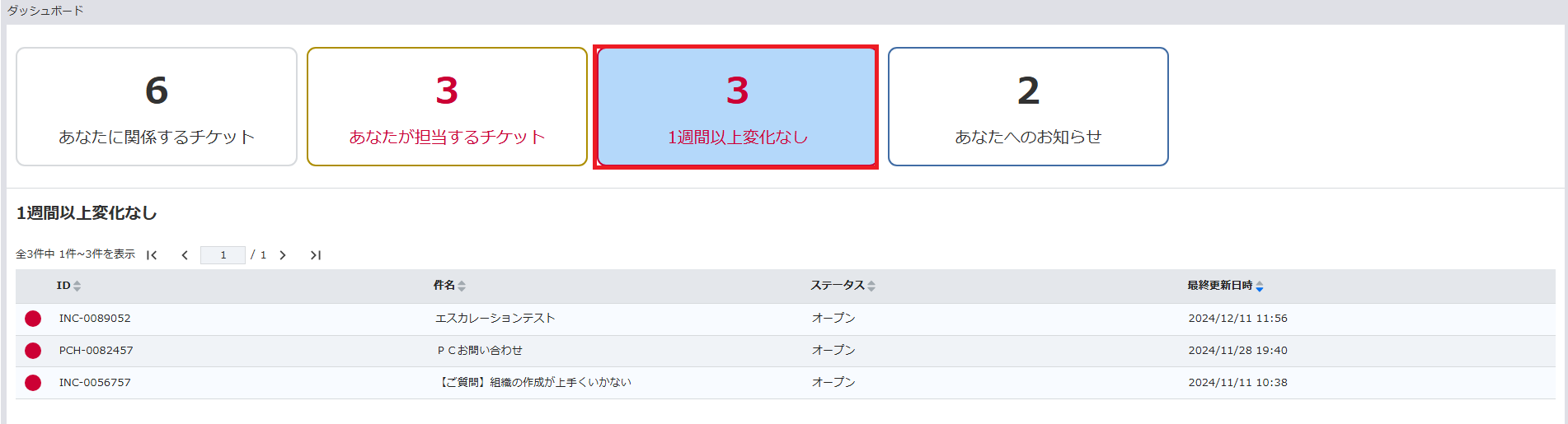 - 「1週間以上変化なし」をクリックすると、対象のチケットの一覧を参照可能です