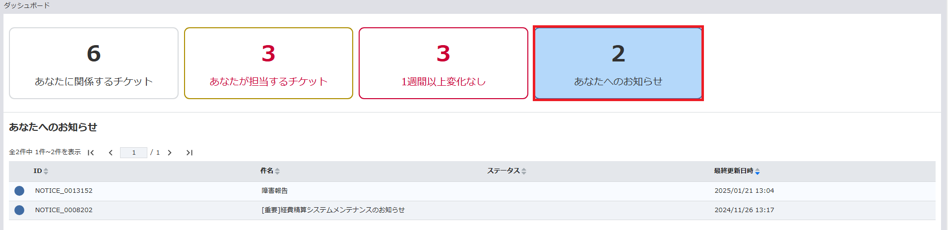 - 「あなたへのお知らせ」をクリックすると、対象のチケットの一覧を参照可能です