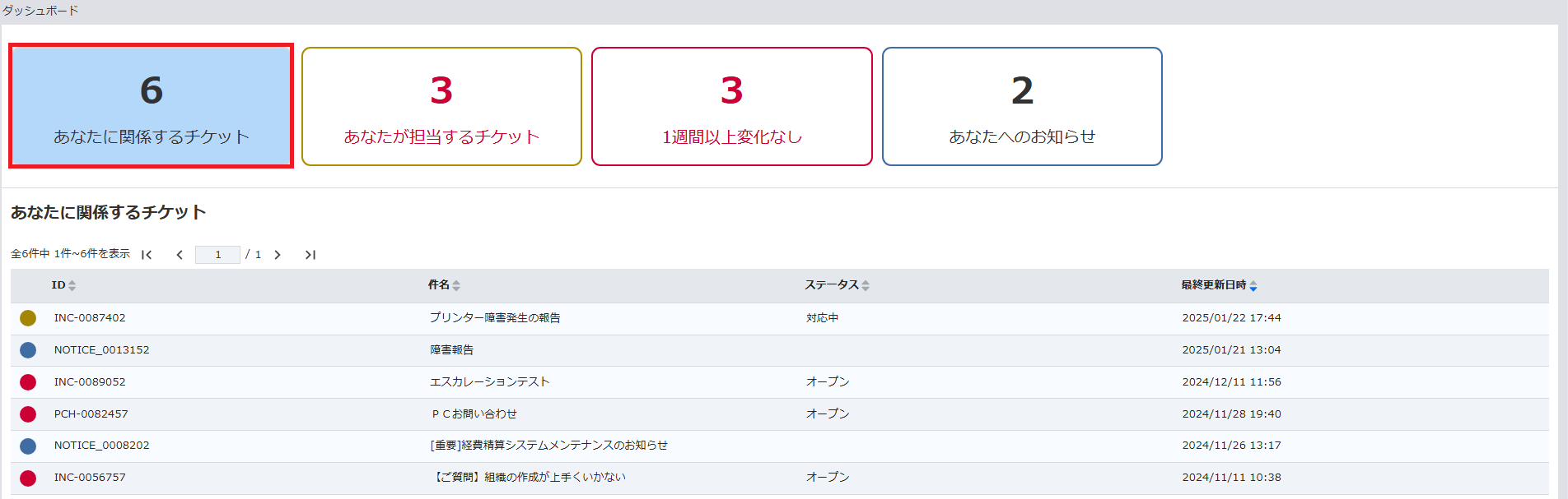 - 「あなたに関係するチケット」をクリックすると、対象のチケットの一覧を参照可能です