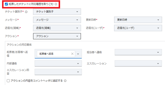 起票したチケットに対応履歴を取りこむにチェックをし、CSVファイル内の各列とチケットのフィールドを対応付けます。