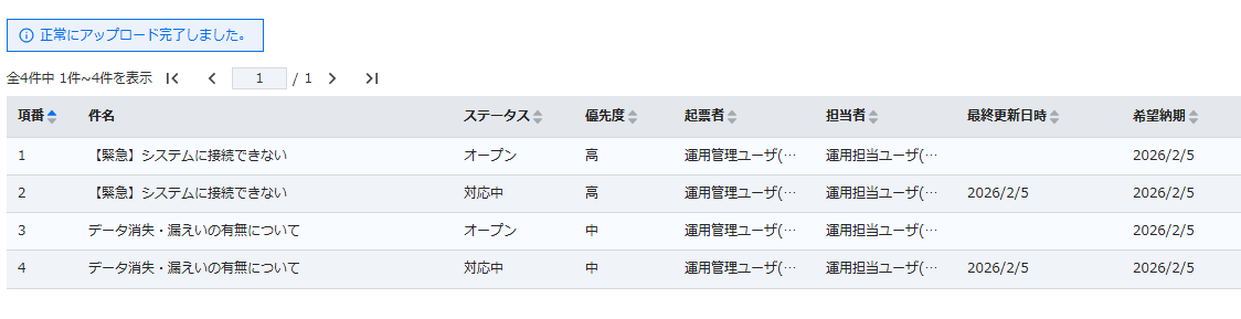 送信 をクリックします。「登録完了 インシデントは正常に一括登録されました」とメッセージが表示されます。