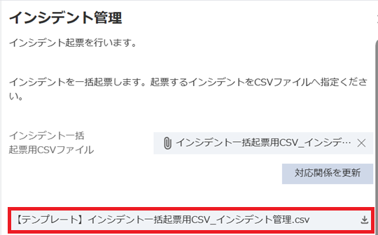 インシデント一括起票用のテンプレートまたは任意のCSVファイルをアップロードする