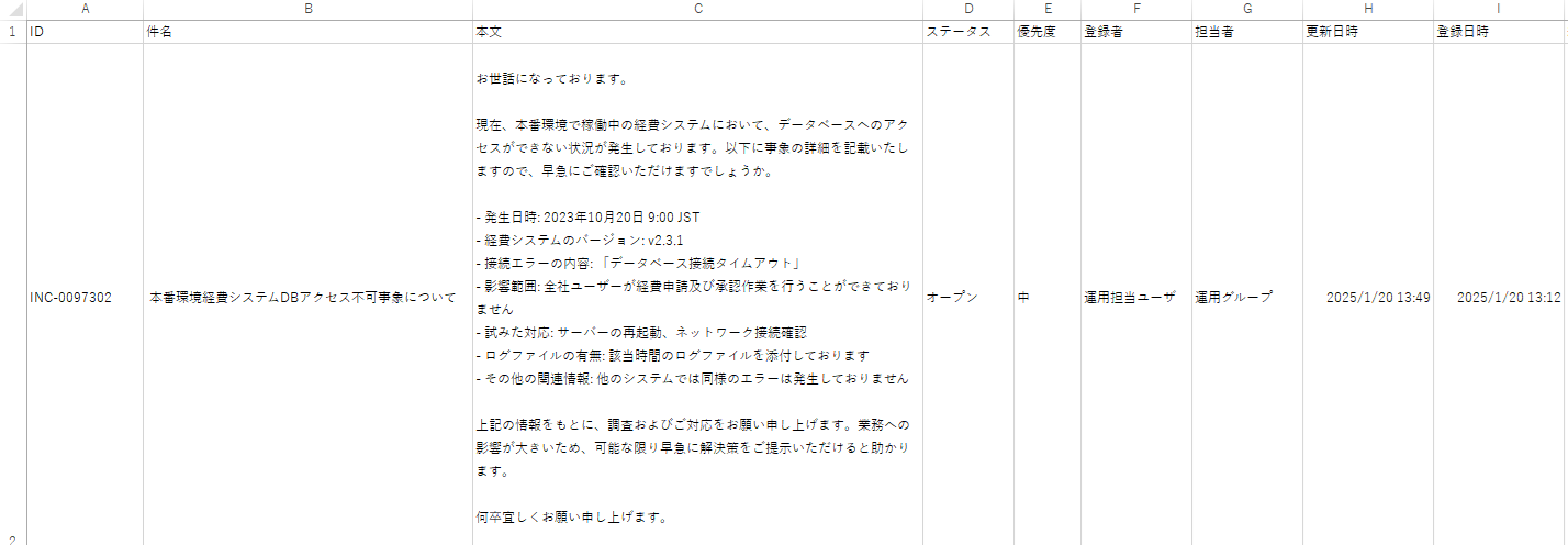 * インシデント一覧画面に表示されている列に加え、インシデント起票時に指定した本文とカスタムフィールドがエクスポートされます