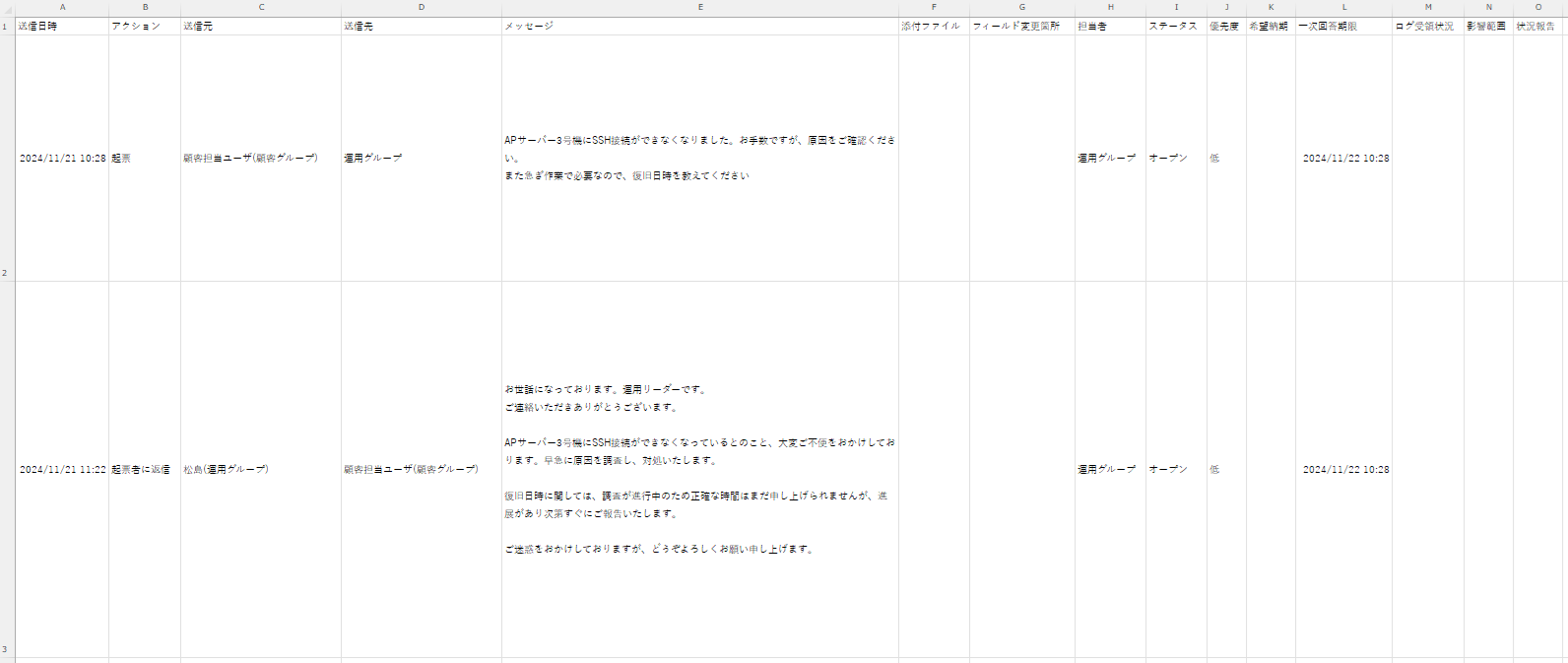 * 送信日時、アクション、送信元、送信先、メッセージ、添付ファイル名、フィールド変更箇所、担当者、ステータス、優先度、希望納期、一次回答期限、カスタムフィールドがエクスポートされます