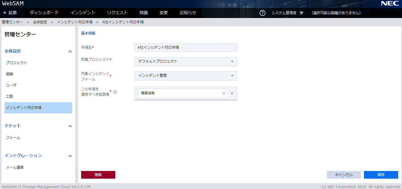 | 対象インシデントフォーム | 「所属プロジェクト」に所属するフォームの中からインシデント対応手順を表示するフォーム名を指定します。インシデント管理フォームのみが選択可能です | 〇 |