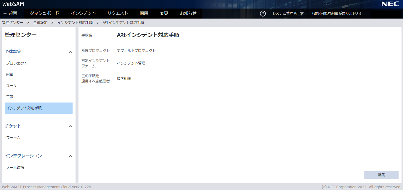 | 手順名 | インシデント対応手順名を編集できます | 〇 |