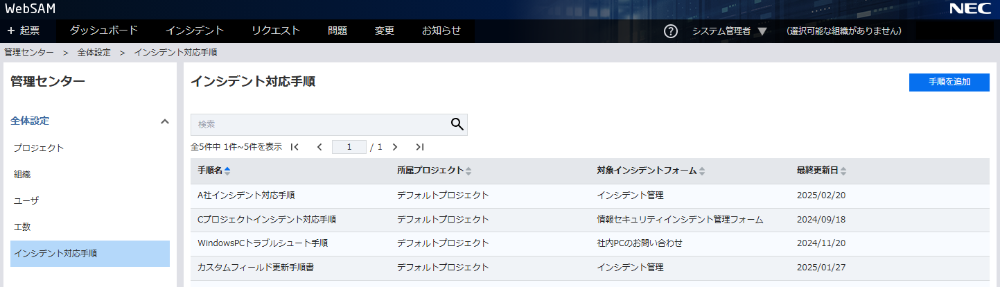 | 所属プロジェクト | インシデント対応手順が所属するプロジェクトが参照できます | プロジェクト追加オプションご契約済みテナントのシステム管理者の場合のみ〇 |