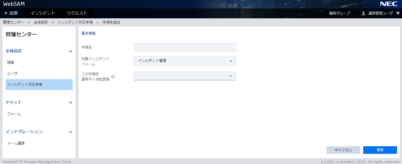| この手順を適用すべき起票者 | インシデント対応手順を表示するユーザ/組織名を指定します | 〇 |