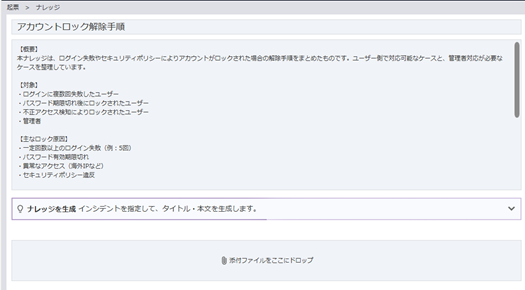 ※ インシデントの内容を元にしたAIによる生成方法については、インシデントを指定してナレッジをAIで生成したいを参照してください。