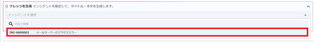展開後、ナレッジの元となるインシデントを指定し、「ナレッジを生成」をクリックします。