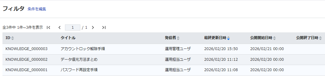 「更新完了 ナレッジは正常に更新されました」とメッセージが表示されます。