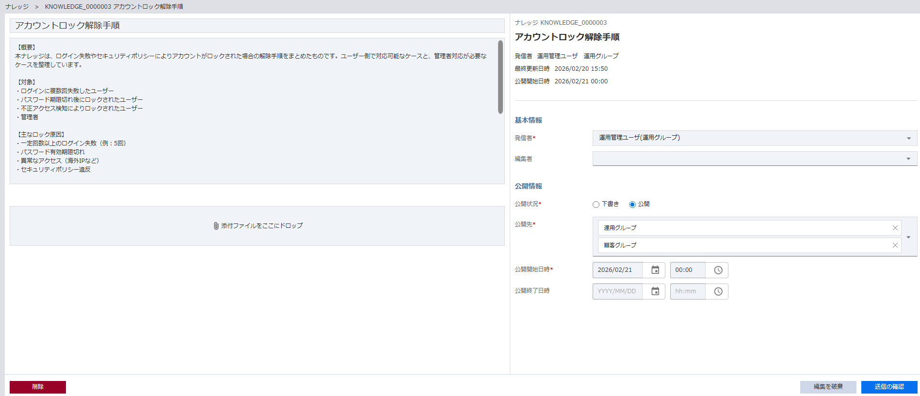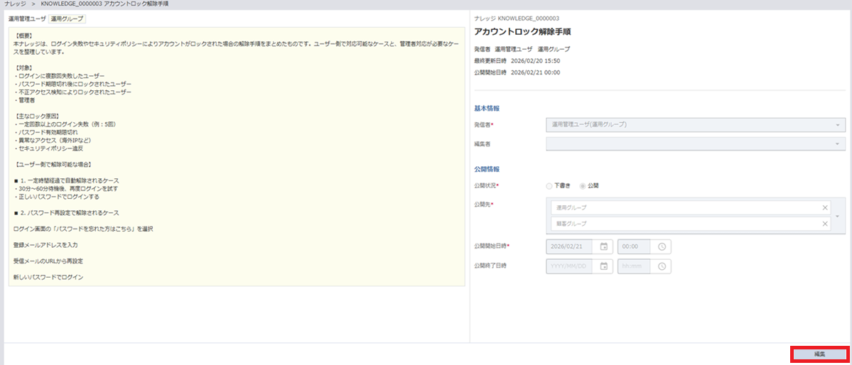 ナレッジ詳細画面の「編集」を押下します。