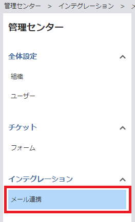 本章ではメール起点でインシデントを起票する方法をご案内します。 以下手順で管理センターへアクセスし「メール連携」画面から設定内容をご確認ください。