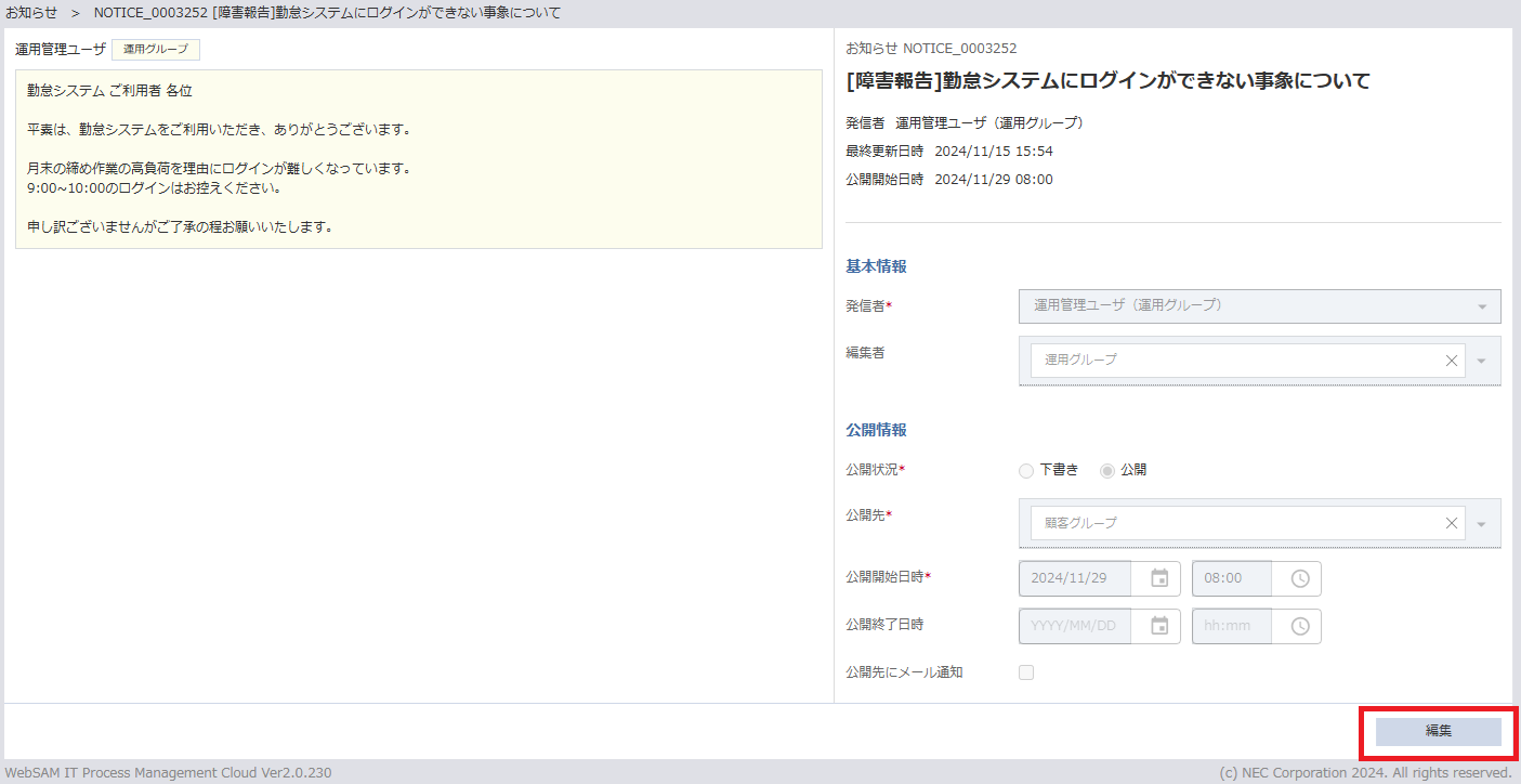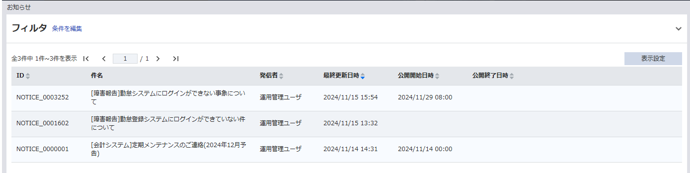 - お知らせ一覧画面から対象のお知らせにアクセスします。