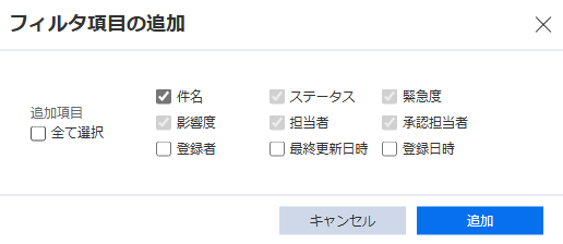 追加したいフィルタ項目を選択し、 追加 をクリックします。