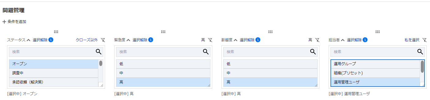 各フィルタ項目に対して、 検索したい任意の値をリストボックスから選択します。