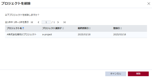 - ダイアログに削除対象のプロジェクト名が表示されていることを確認し、 削除 をクリックします。