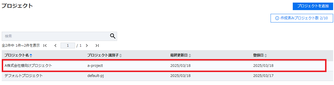 - プロジェクト一覧画面で、削除対象となるプロジェクト名をクリックします。