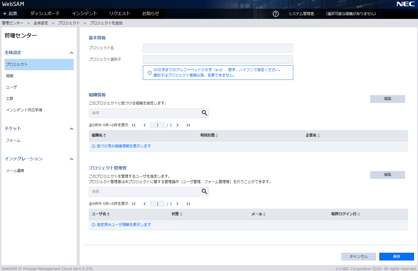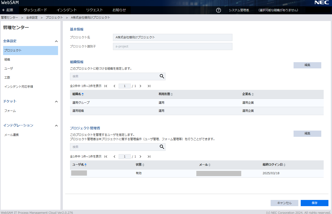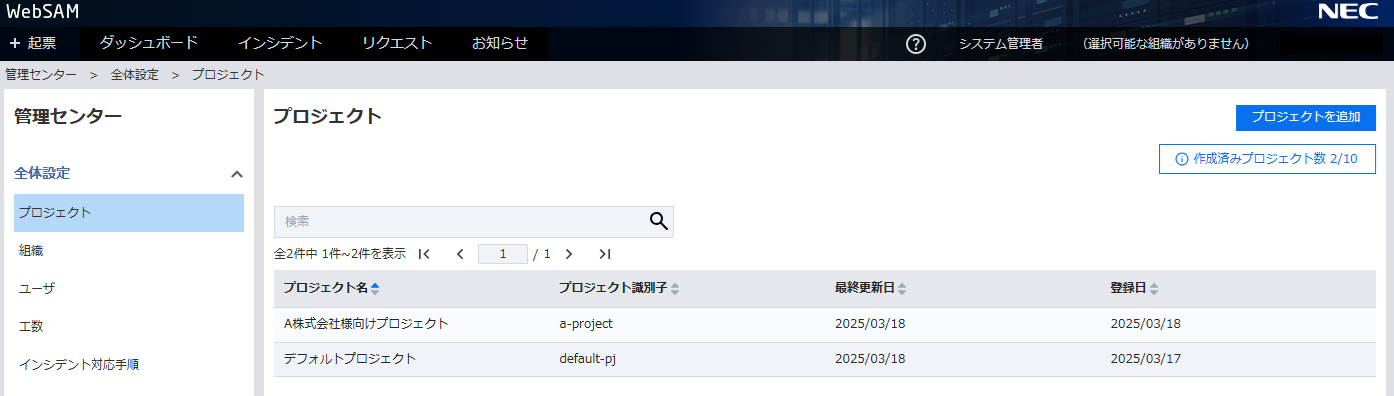 また、プロジェクト画面はシステム管理者のみが参照可能です。