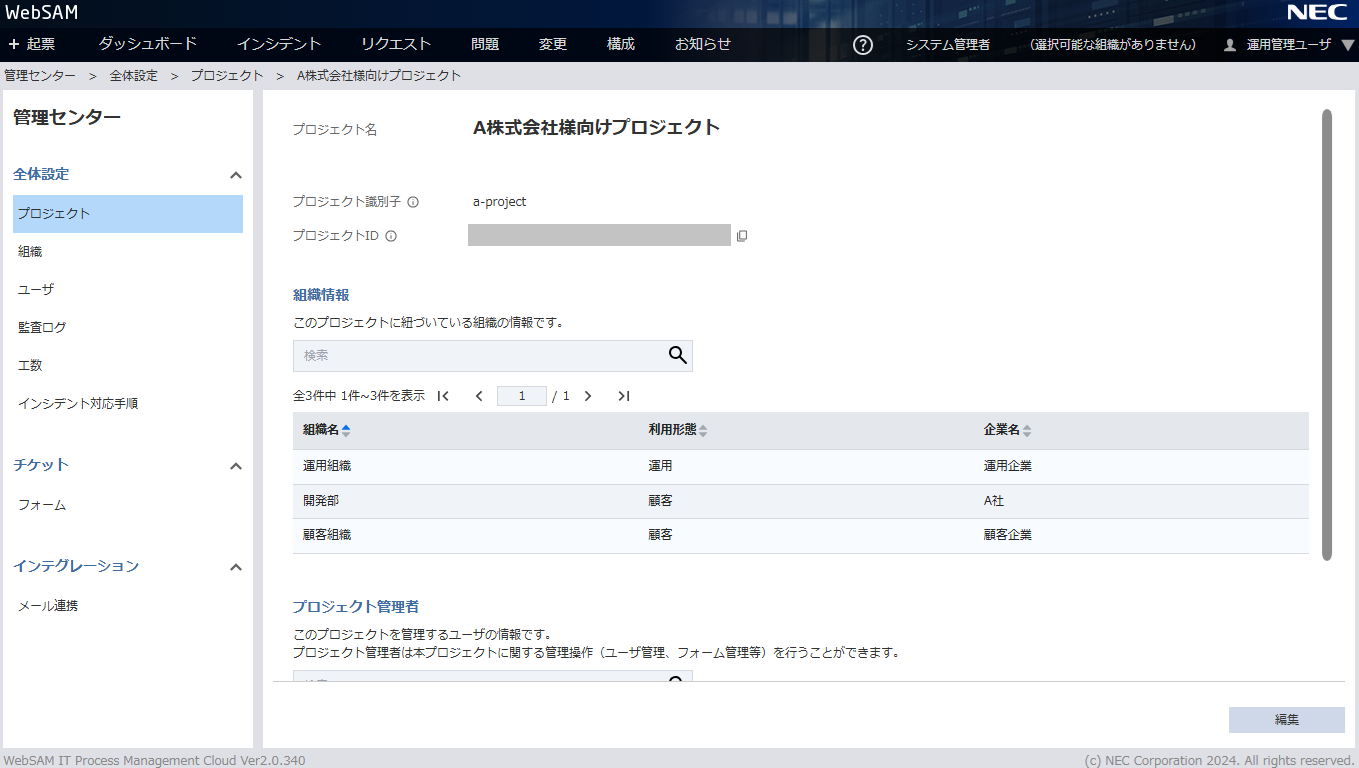 プロジェクトID欄で取得したuuidは、WebSAM Automatic Message Call(AMC)のITPM V2連携機能や、外部API連携機能の設定時にご利用いただけます。