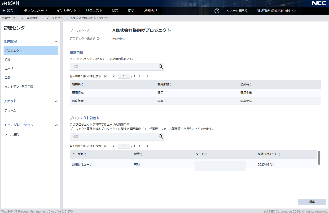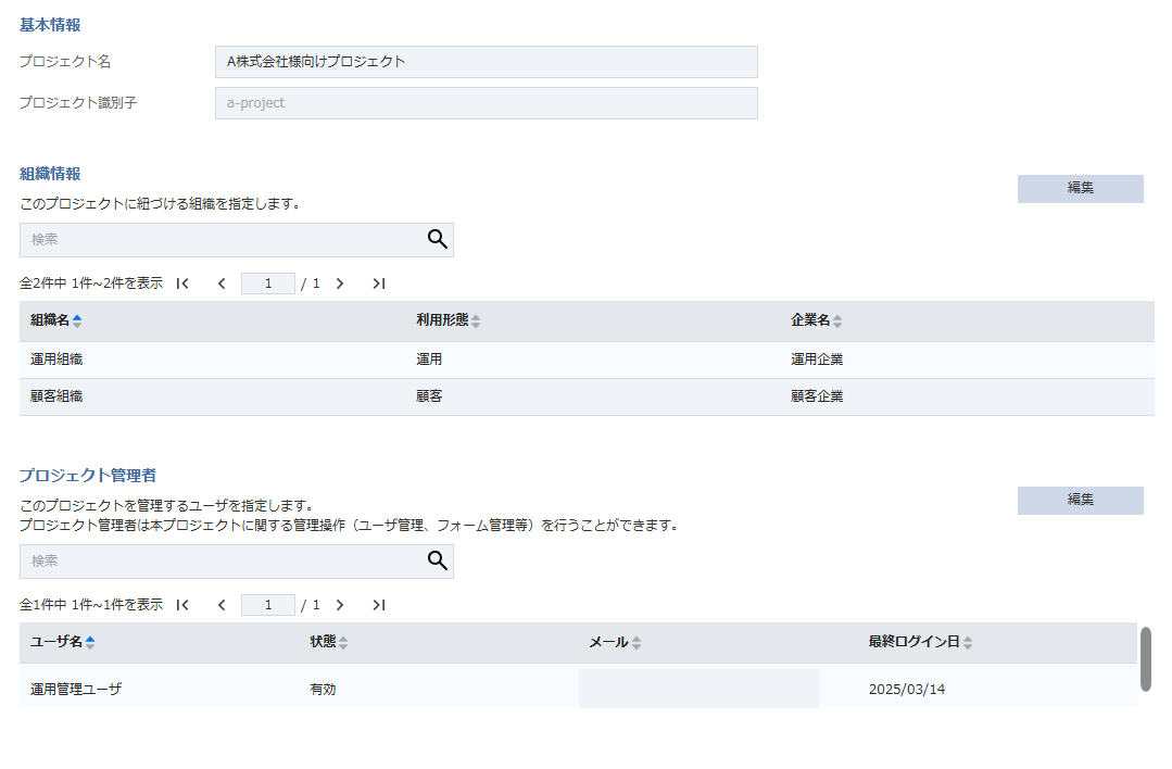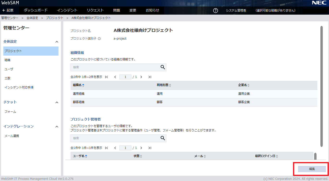 - プロジェクト詳細(閲覧モード)画面で、 編集 をクリックします。