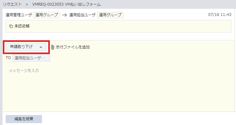 「申請取り下げ」は承認担当者が承認操作を実施する前までの間に限り実行可能です。承認操作実施後に申請を取り下げたい場合は、承認担当者へ差し戻しの依頼を実施ください。