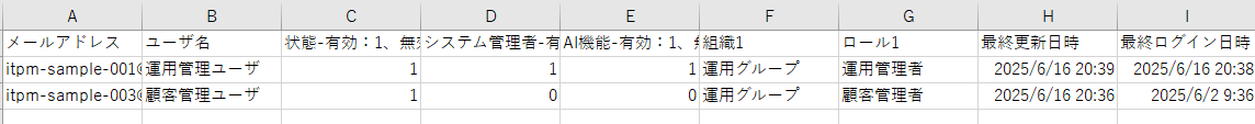 * ユーザ一覧画面に表示されている項目に加えて、所属プロジェクトや組織、ロール情報、AIオプションの設定状況もあわせてエクスポートされます