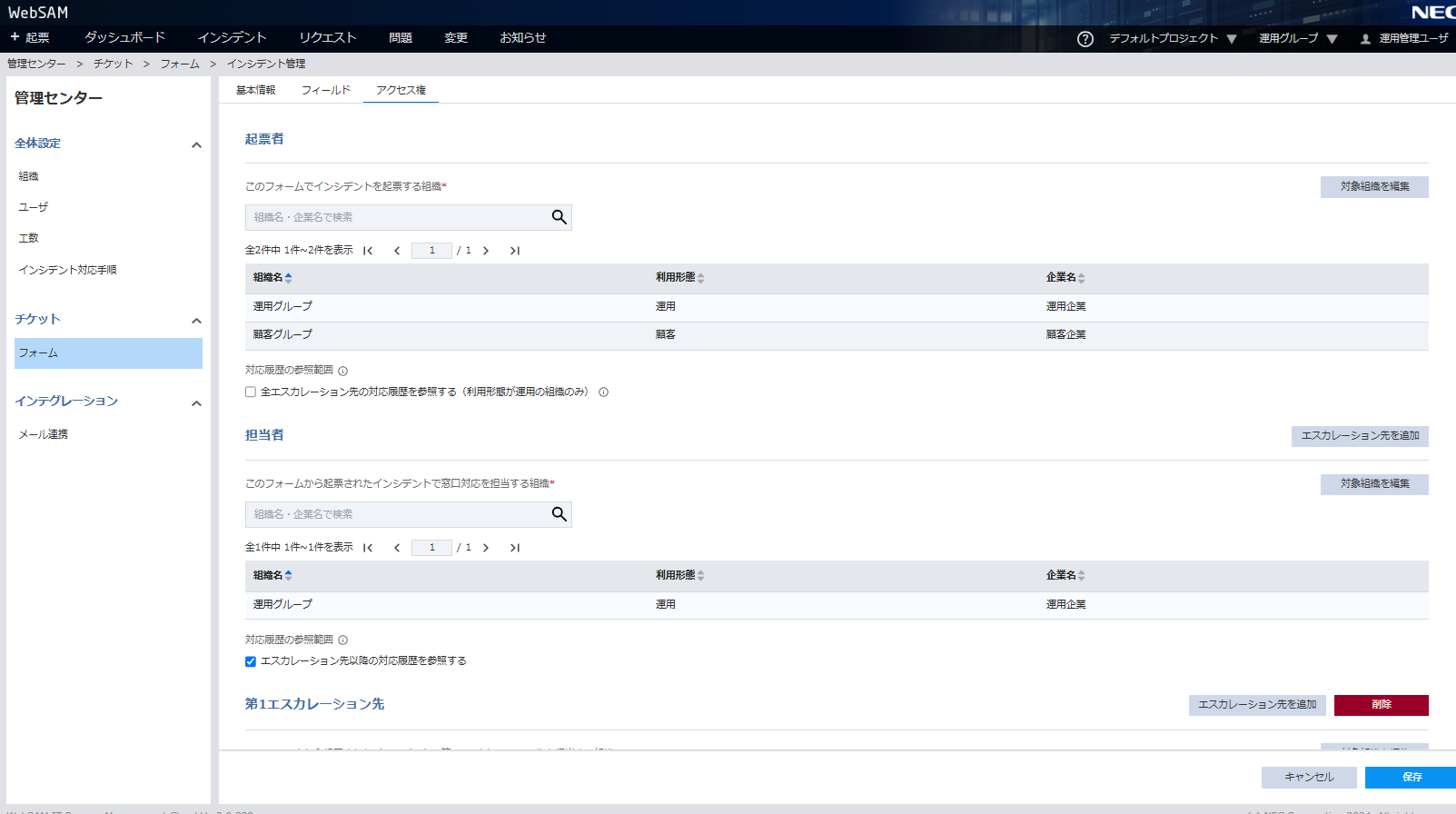 インシデント管理フォームごとに起票者・担当者・エスカレーション先アクセス権を定義し、各アクセス権に対してチケット情報の参照範囲を設定できる新機能を追加しました。